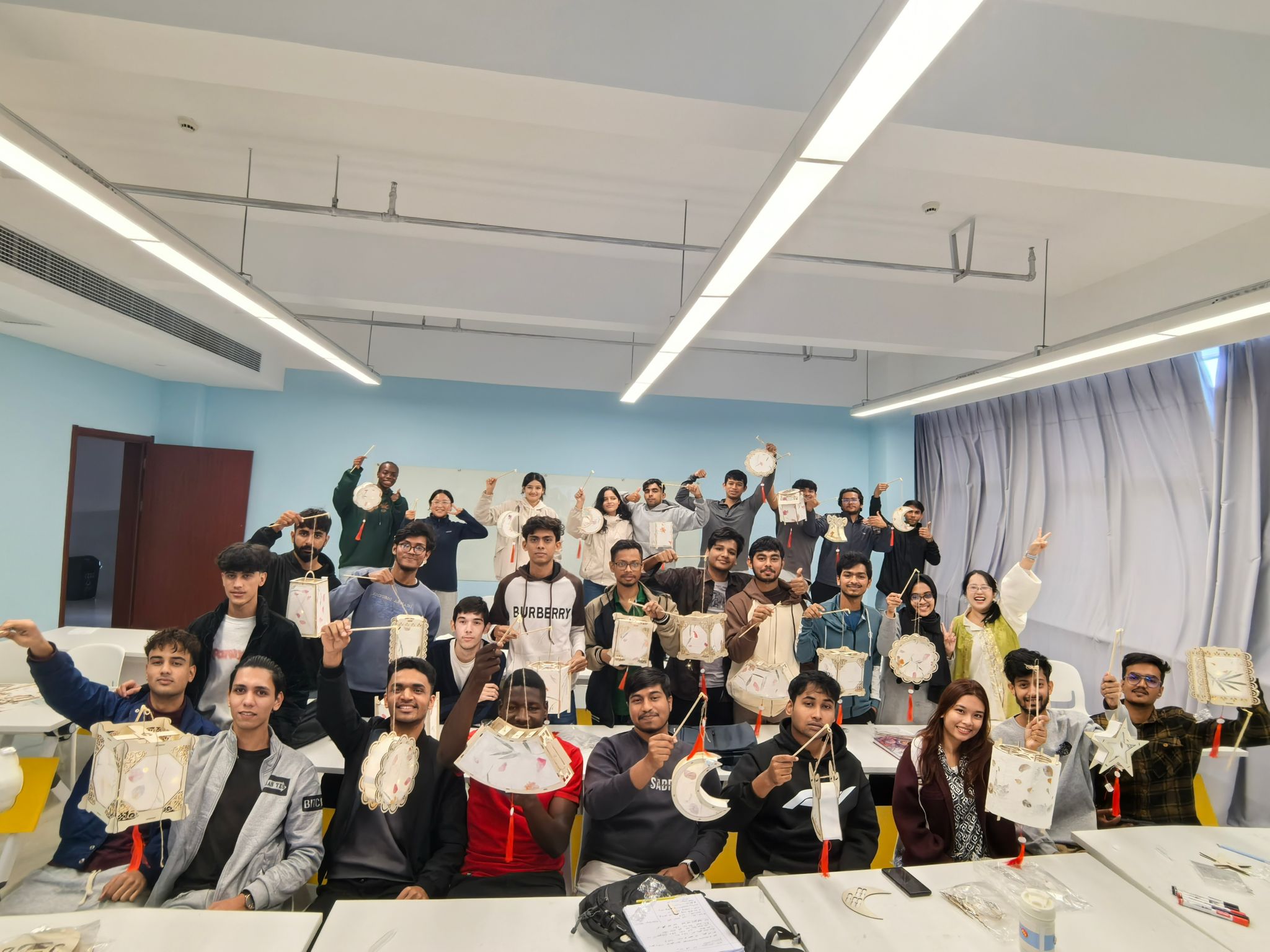 活动在轻柔的中国传统音乐中拉开帷幕。破冰环节的“光影接龙”迅速拉近了彼此距离。在了解灯笼承载的“团圆与希望”文化寓意后,同学们在罗老师的引导下进入专注的创作阶段。裁剪宣纸、描绘图案、组装灯架,指尖的细致操作成为凝聚注意力的“正念练习”。随着一盏盏独具特色的灯笼渐次成型,活动迎来了最动人的“点亮仪式”——室内灯光暗下,四十盏手工灯笼同时亮起,温暖的光芒瞬间照亮了整个空间,也映照出同学们惊喜与感动的脸庞。在随后的分享中,巴基斯坦学生艾哈迈德动情地说:“这盏灯让我想起了家乡的节日,虽然远离家人,但在这里我感受到了同样的温暖。”杨意健同学则表示:“教国际同学做灯笼的过程,让我对传统文化有了新的理解。”