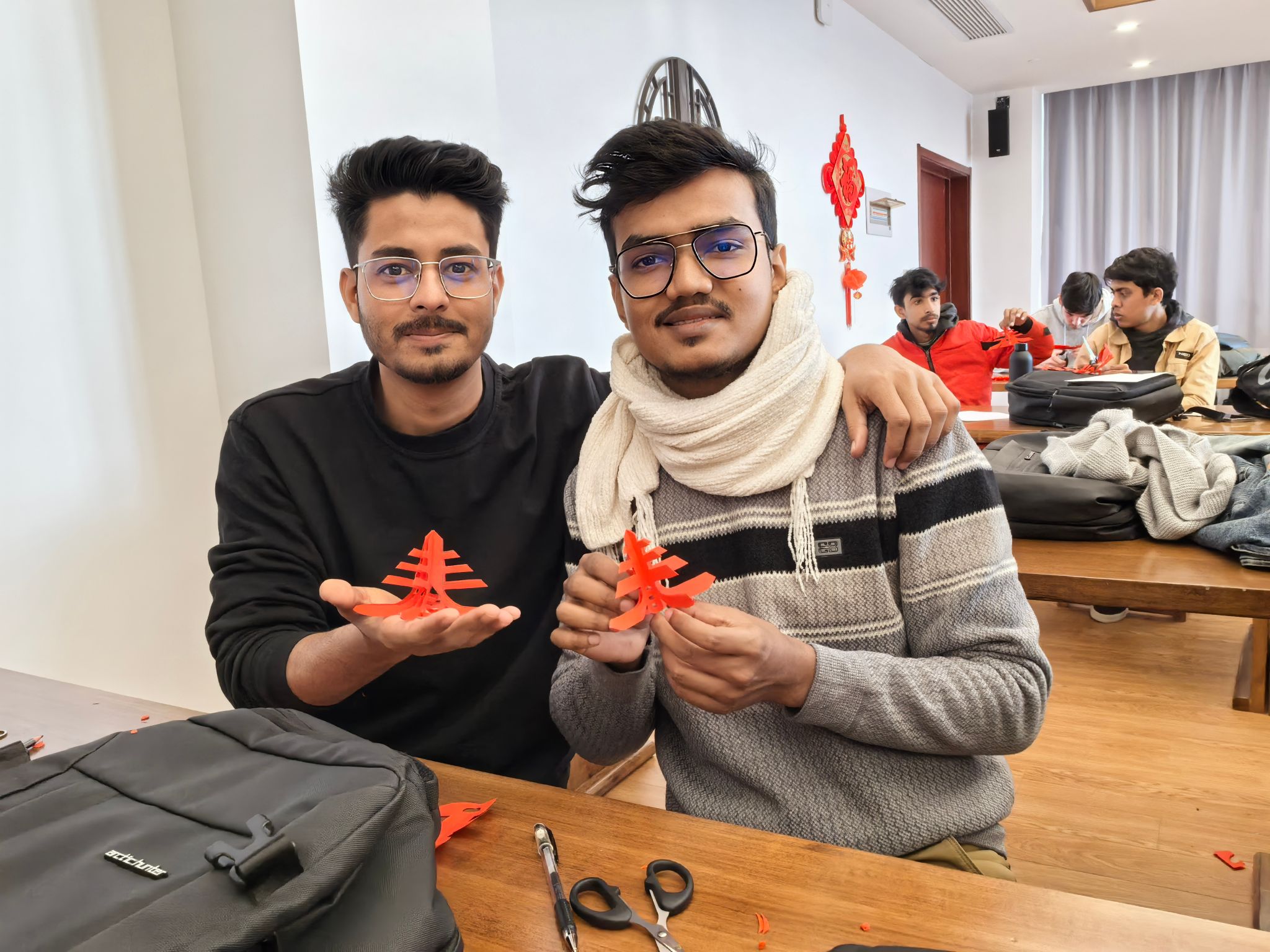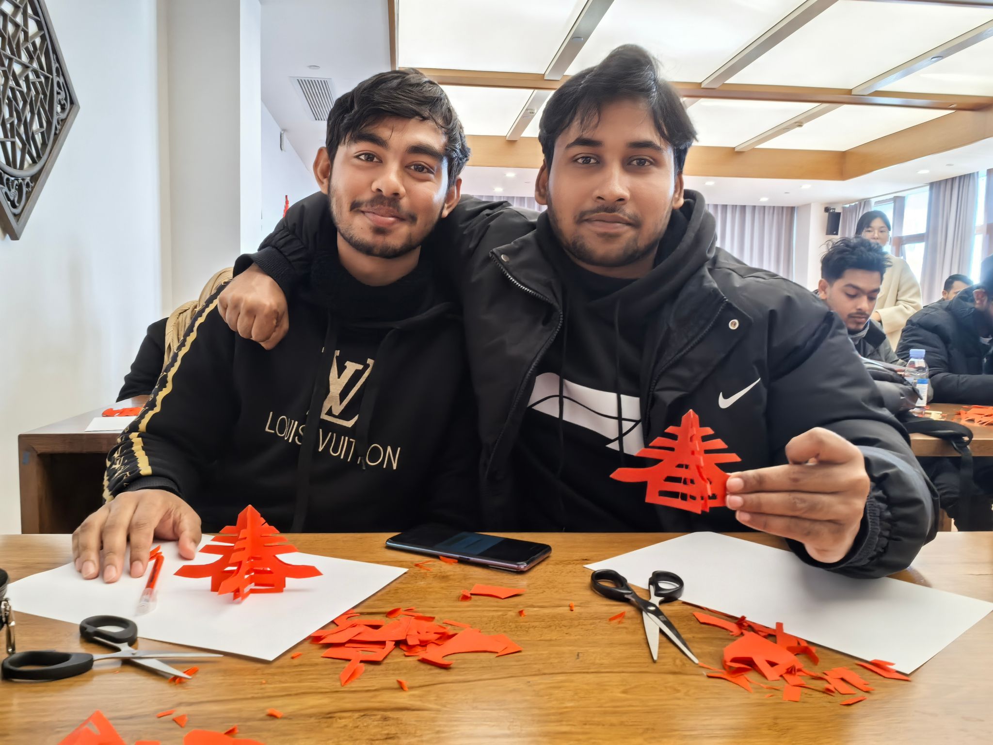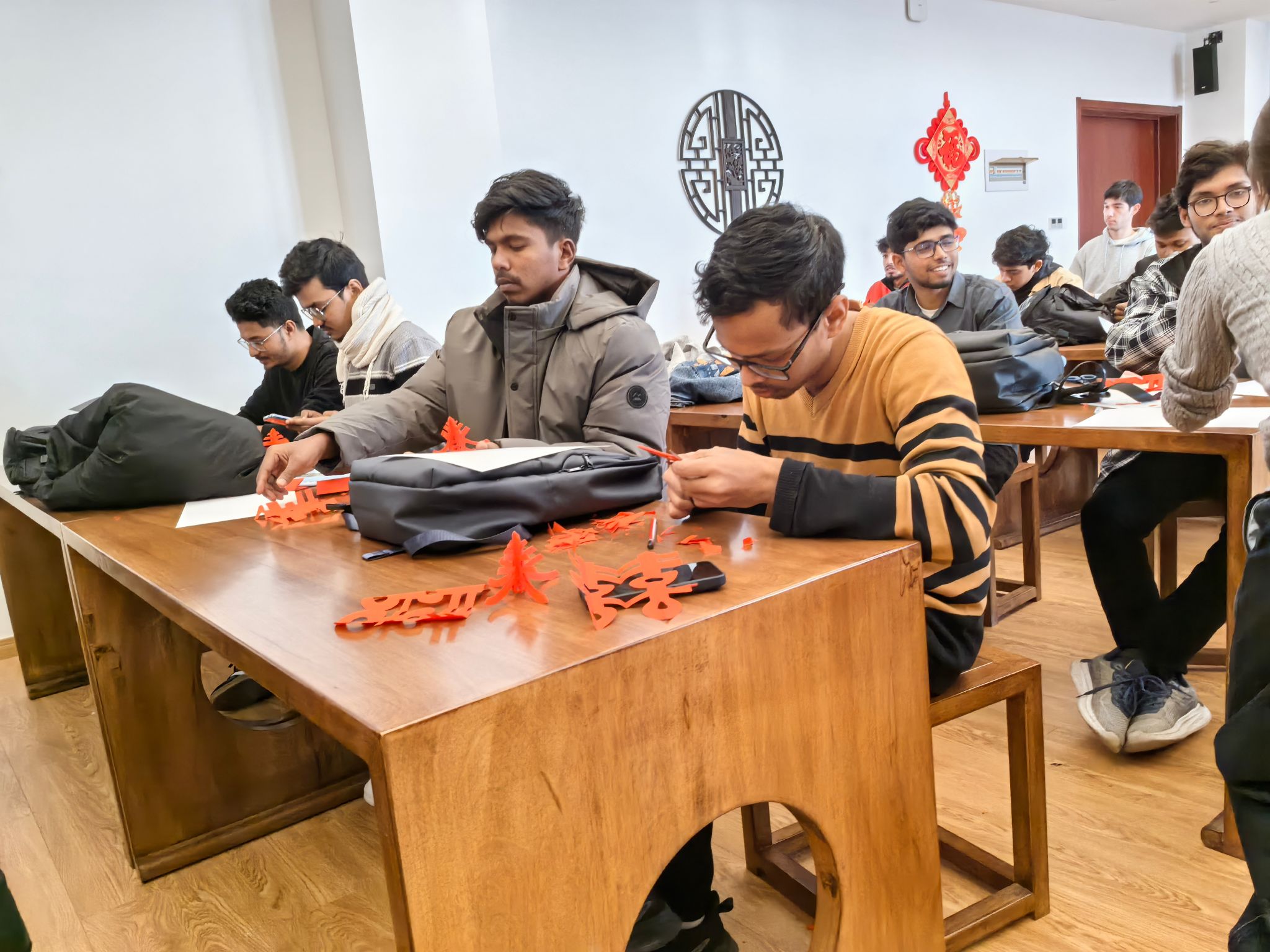 活动在轻松愉悦的氛围中展开。在专业心理老师和剪纸艺人的引导下,学生们从学习剪制简单的“囍”字、窗花等传统纹样开始,逐步投入到创作中。剪刀在红纸上蜿蜒游走,专注于指尖的精细动作让学生们暂时忘却了学业的压力与琐事的烦扰,进入一种“正念”的平静状态。随着创作的深入,中外学生们互相交流技巧、分享成果,现场充满了欢声笑语。一幅幅独具匠心的剪纸作品,不仅是艺术的呈现,更是他们当下情绪与内心图景的真诚表达。