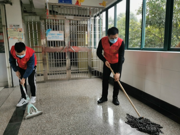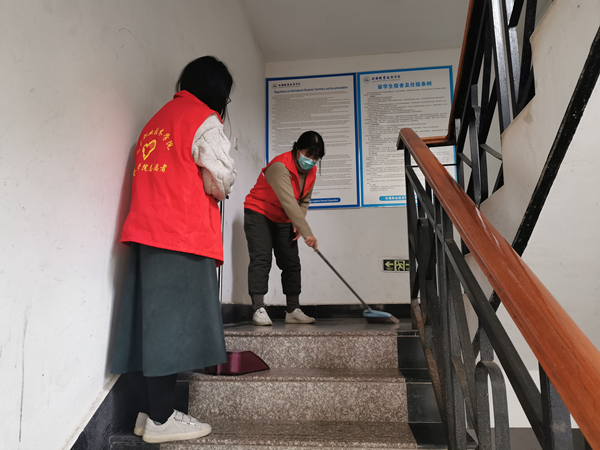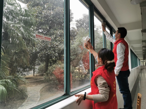 参与活动的党员教师带着清洁工具来到学生宿舍公共区,在走廊擦拭玻璃,清洁地面,后院除草,室内消毒。经过3个多小时的服务活动,学生宿舍公共区域环境美化取得成效。志愿服务结束后,党员教师纷纷表示“疫情期间,能为校园美化和安全贡献力量我门感到很自豪这是我们党员教师的初心和本色”。