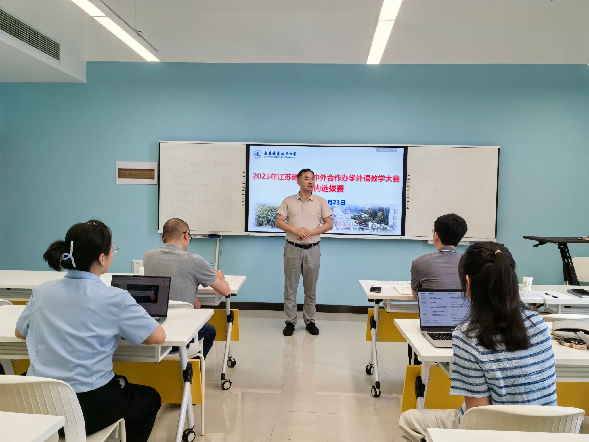 本次校内选拔赛严格遵循公平、公正、公开原则,全程规范流程、精准把关:经教师自主报名、各二级学院择优推荐,共有来自集成电路学院、物联网工程学院、财经学院等多个教学单位的专业教师参与;比赛现场,参赛教师围绕中外合作办学课程特点,结合教学创新实践设计展示内容,充分展现了我校教师在国际化教学中的专业素养与教学智慧;评审环节,由校内中外合作办学领域专家、资深教学骨干组成评审团,从教学目标、内容设计、方法创新、语言能力、育人实效等多维度进行综合评议,最终确定推荐集成电路学院、物联网工程学院的两位教师代表学校出征2025年江苏省中外合作办学外语教学大赛。