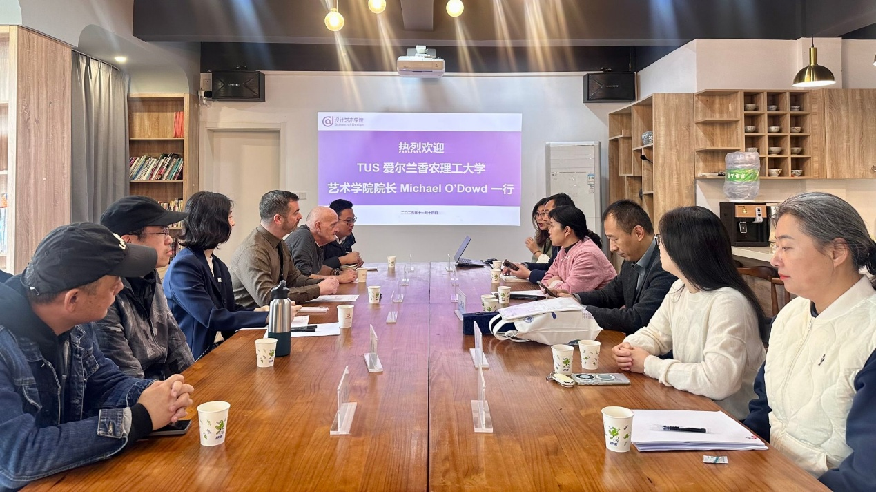 在交流座谈环节,我校设计艺术学院院长杨敏、爱尔兰学院院长张晓明、副院长蒋宏成、广告艺术设计专业系主任王雯及相关专业骨干教师参与会谈。双方围绕艺术类专业合作、课程共建与教学资源共享等议题展开深入交流,并就推动专业合作的深化达成共识。