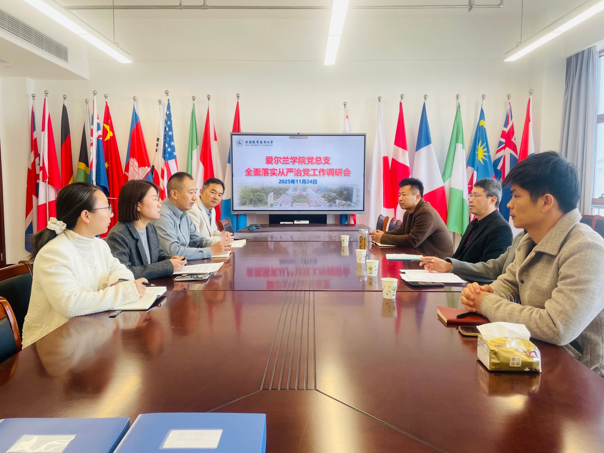 为深入贯彻落实全面从严治党要求,压实管党治党政治责任,11月24日上午,校党委委员、副校长奚茂龙率队前往爱尔兰学院,就全面从严治党工作落实情况进行专题调研并指导工作。爱尔兰学院班子成员、党支部书记参加了调研座谈会。