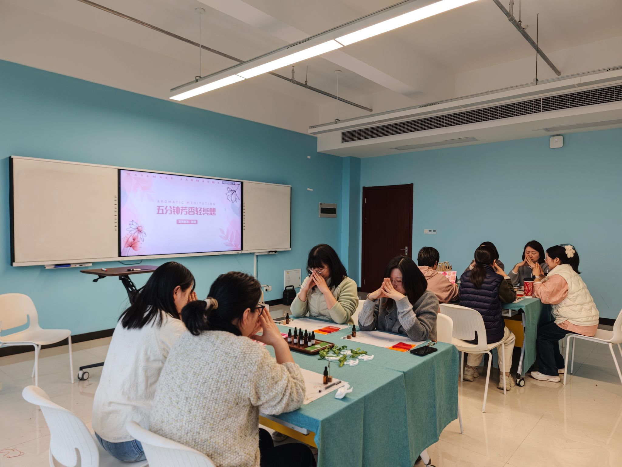 制作间隙,大家互相品鉴各自的作品,分享制作心得与生活感悟。伴随轻柔舒缓的音乐,一场简短的闻香冥想让大家暂时放下工作的繁忙,沉浸于身心的舒缓与放松。“平时教学科研节奏快,难得有这样完全属于自己的时光,闻着自己调出的香气,特别治愈。”一位参与活动的老师说道。